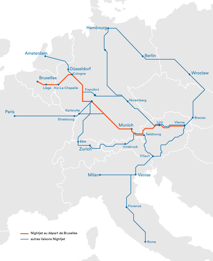 Le train de nuit Nightjet relie l'Autriche à de nombreuses villes d'Europe :