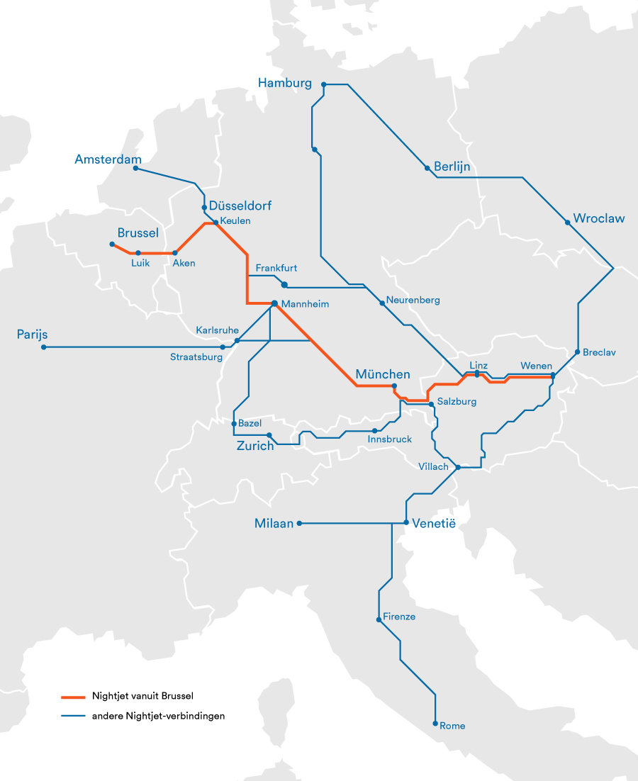 Met de Nightjet nachttrein reis je in alle comfort tussen Oostenrijk en België, Nederland, Duitsland, Zwitserland en Italië.
